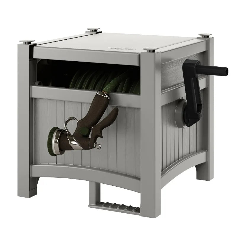 Simplify your hose storage needs with this Hose Hidden Reel. This Hose Hidden Reel can store up to 100 feet of 5/8-inch standard vinyl hose. The durable resin construction is easy to maintain and requires no assembly. The side handle helps you easily roll the hose into the hidden reel. This low-maintenance resin hose hidden reel is very convenient and will keep your yard looking organized and beautiful. Improve your outdoor space with this hose hidden reel today.
