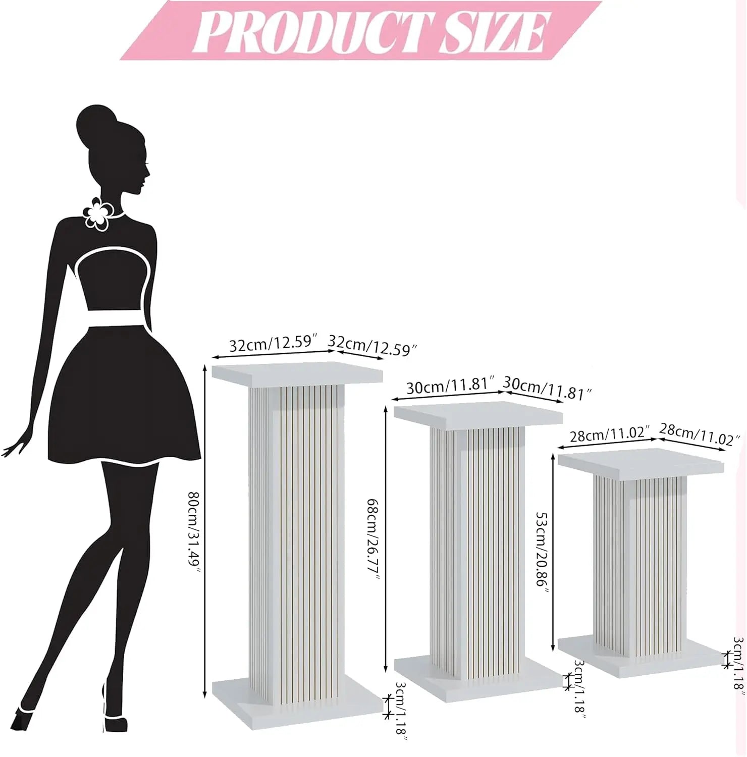 - Different Sizes: Use our pedestal stand for parties to upgrade the visual appeal of your dessert display or backdrop for your important occasions. The display stand set includes three sizes: (L) 31.49*12.59 in, (M) 26.77*11.81 in, (S) 20.96*11.02 in. The appropriate height can be selected according to different needs and occasions to ensure that a variety of items are displayed to meet your display needs