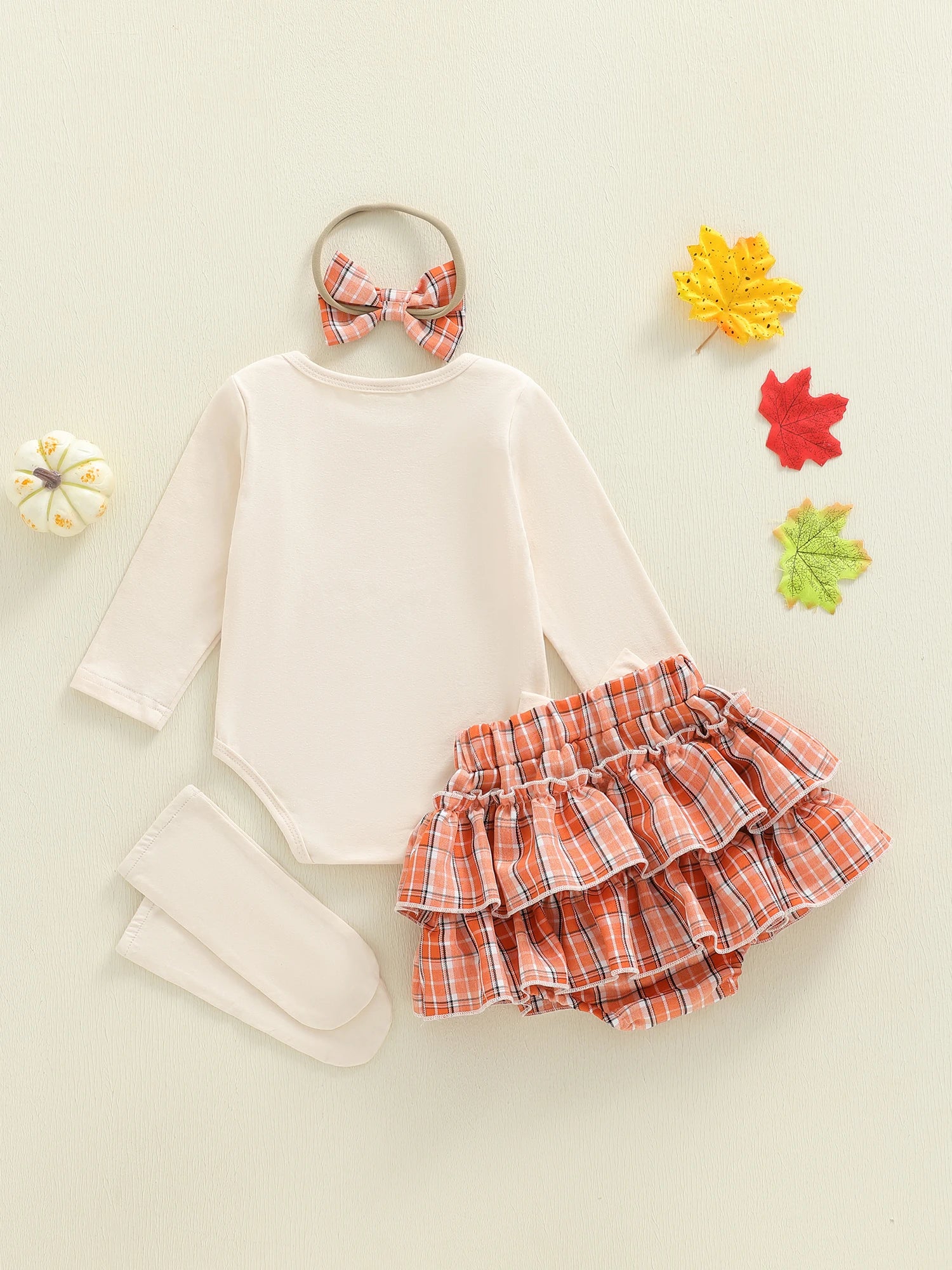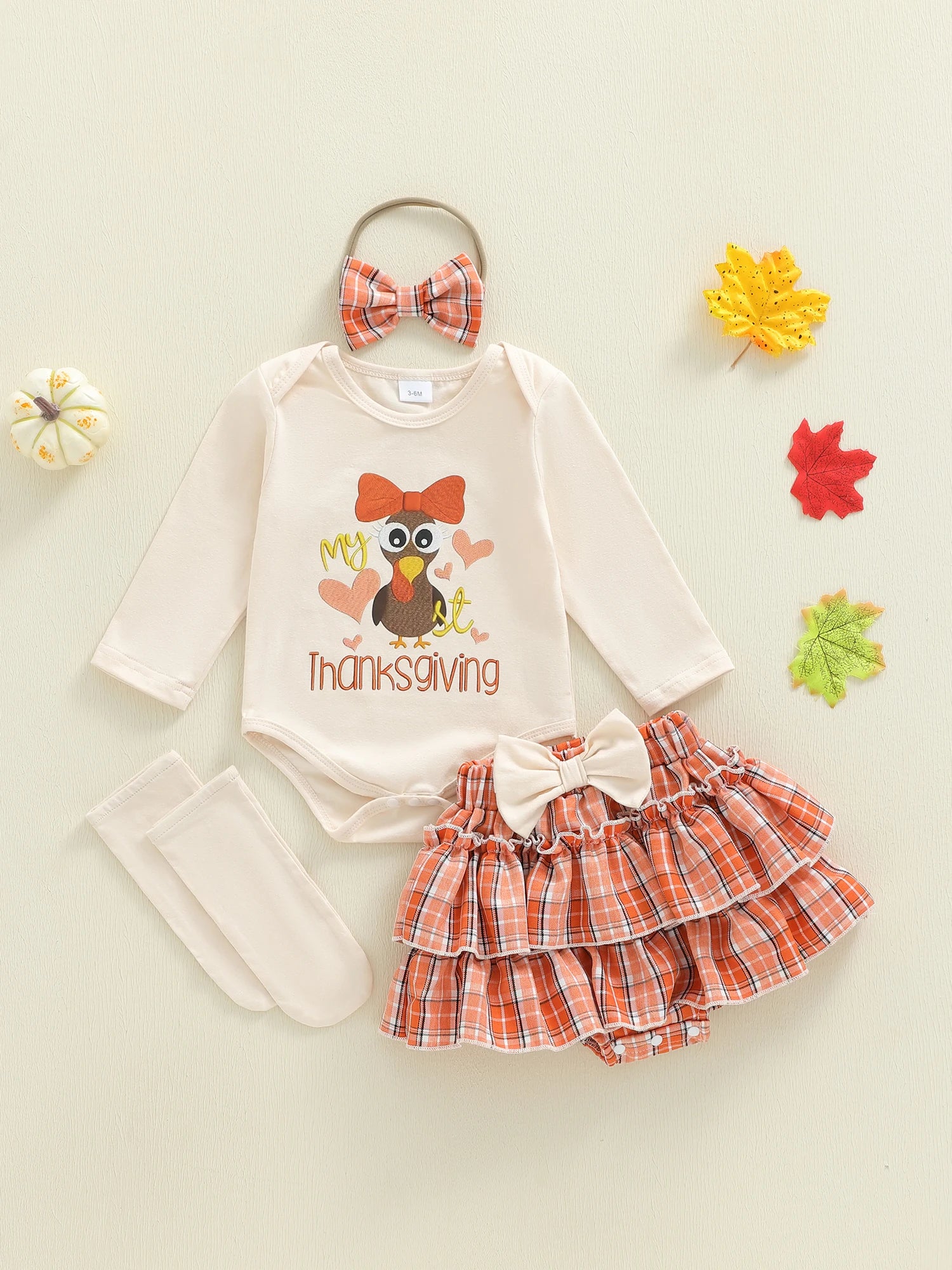 Thanksgiving Baby Girl Outfit Turkey Print Romper with Plaid Layered Mini Skort Stockings and Bow Headband Set - Fall