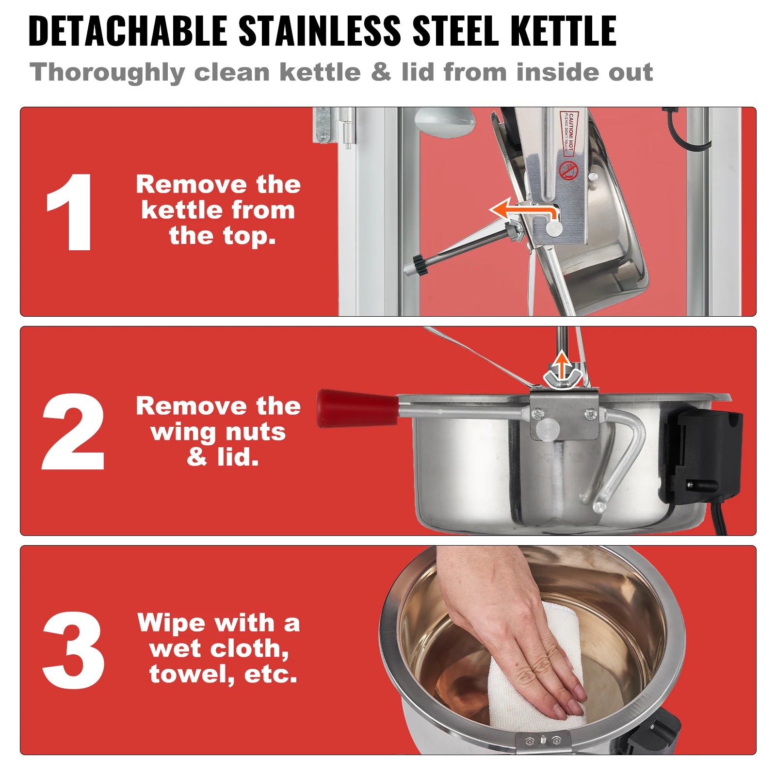 Durable Structure, Effortless Cleaning: This countertop popcorn machine comprises a cold rolled steel frame and tempered glass panels to withstand frequent use. The doors with magnetic latch provides quick access and enhances the appearance of the popcorn inside. The printed graphics on its top may also catch some hungry stares. Besides, the wing nuts on the kettle allow you to detach its lid easily and clean its interior thoroughly. Hassle-free cleaning will extend the machine's service life.