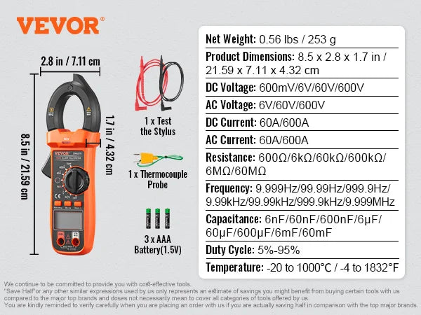【Multifunctional Clamp Meter】: Get precise readings with ease! This clamp meter measures DC/AC current, DC/AC voltage, frequency, and resistance. Plus, it has added functions of diode test function, circuit on/off test, data retention, capacitance, and relative value measurement. It's perfect for measuring power!—Remark: 600A 6000 Counts-2 and 10000A 6000 Counts contain additional fuctions ofDuty cycle and Max./min. value measurement.
